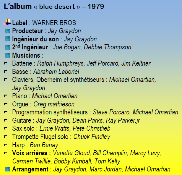 Mon avis : « blue desert » pose de nouveaux jalons en termes de sonorités westcoast en alternant des titres mélodieux édulcorés avec un Rhodes bien appuyé et d’autres soft rock plus classique qui ne renient pas la variété de son époque. On entend même la matrice mélodique de Jay Graydon, simple et efficace, qui conduira l’année suivante à la production de l’album « this time » de Al Jarreau. Les solos au saxophone de Ernie Watts sur "generalities" et de "beautiful people" et celui à la trompette de Chuck Findley sur "lost in the hurrah" sont une invitation à un voyage initiatique sur le terrain de ce qui deviendra plus tard l’essence du smooth jazz. Les solos de guitare de Jay Graydon, devenus légendaires, rappelle le pédigrée du label ; californien pur sucre. Pas de sophistications instrumentales non plus à la PAGES, ni de messages subliminaux dans les textes, Jay Graydon et Marc Jordan se sont accordés sur une idée ; faire du beau avec du simple ; quelques mélodies habillés du minimum instrumental valide un album bien construit, cohérent qui a bien vieilli devenu par la suite un masterpiece incontournable pour tous collectionneur de vinyles A.O.R.