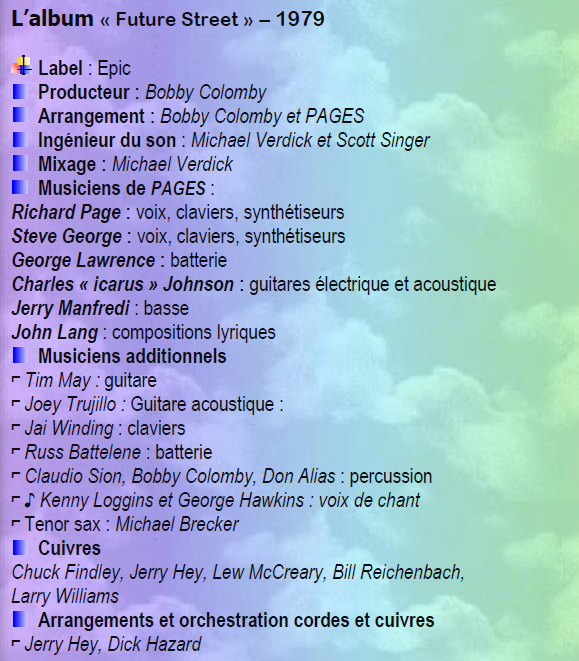 Mon avis : On peut considérer la face 1 comme un compromis artistique, car il explore les talents de PAGES en matière de pop-rock pour satisfaire et convaincre un public peut être déçu par l’orientation trop jazz fusion du premier album. La face 2 reprend les ingrédients pop funk / jazz fusion de la première salve et monte d’un niveau en terme de moyens consacrés à la production. Les arrangements sont tout autant novateur sur la forme et le fond, le Fender Rhodes toujours là se fait plus discret, le mini moog comme marqueur sonore aussi, les guitares sont toujours aussi expressives. On remarque cependant que les compositions et les interprétations vocales sont travaillées d’avantages pour marquer les esprits, voire susciter l’envie de chantonner… Le choix de l’ingénierie du son d’adoucir et de niveler la dynamique générale est peut être un choix stratégique vers une standardisation mais il fait perdre un peu de relief aux instruments par rapport au premier album. L’objectif de « Future street » était de consacrer PAGES comme un groupe qui compte en 1979, mais il reste encore trop novateur et expérimental pour l’époque. Il est aujourd’hui un fer de lance pour les nostalgiques de cette époque révolue et un « must have » pour tout bon collectionneur de westcoast, on se demande presque s’il n’as pas été produit dans cette esprit. « Future street » est une preuve supplémentaire que les meilleurs albums ne sont pas les vendus, les meilleurs artistes les plus connus. PAGES ont été quelque part trop intègres pour promouvoir un album facile à écouter, ils se sont acharnés à composer, jouer et chanter des compositions que beaucoup sans le dire aiment à écouter pour s’en inspirer.