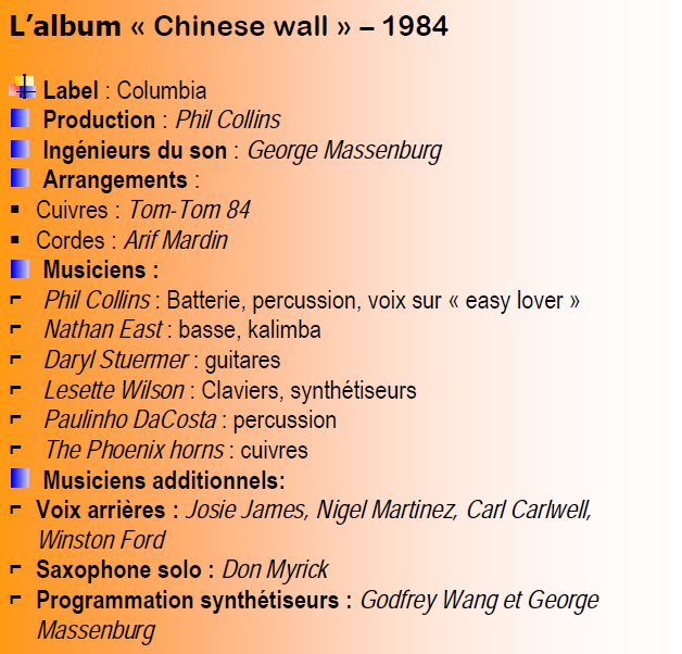 Mon avis : C’est dans les meilleures marmites que l’on fait les meilleurs plats, « chinese wall » a été enregistré à Londres avec une brochette de musiciens américains invités à y rester longtemps pour y mijoter le meilleur album de Philip Bailey et sans doute la meilleure réalisation de Phil Collins comme producteur. L’enregistrement très spatialisé met en valeur un jeu de musiciens en nombre réduit traduisant une complicité et leur investissement personnel au projet. Les cuivres, les cordes et quelques percussions ont été enregistrés à Los Angeles sans doute pour des raisons pratiques de personnel et de session d’enregistrement. En détail, on distingue les titres rythmés pop, limite rock : "photogenic memory", "Walking on the chinese wall", "easy lover", "time is a woman" et "woman". Funk rude ou soft rock, ils sont taillés pour les radios et les clubs ; les ajouts de cordes et de cuivres leur donnent une coloration R&B. Les ballades "for every heart that’s been broken", "show you the way to love" ; sublimes, rappellent celle du répertoire de EWF. Enfin "children of the ghetto" est une reprise d’un titre de THE REAL THING, sa réinterprétation est une réinvention de la soul, celle qui vous met en transe. Plus qu’un album, « chinese wall » est une potion magique de la grande époque, celle où on rentrait en studio avec un projet et des idées avec des moyens au service de ses ambitions.