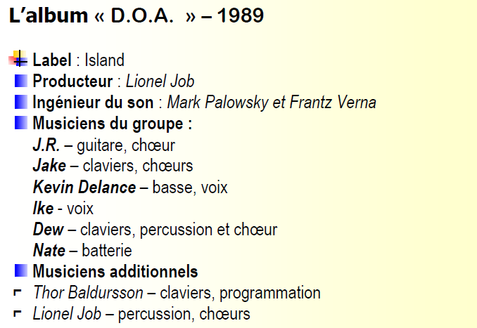 Mon avis : Le marketing de la pochette est assez évocatif de l’univers de Atension, un funk féroce et sans concession ; basé sur une boite à rythme bruyante mais entraînante. Un esprit rock assumé, l’ambition de D.O.A., risqué, peut être illustré par le dicton « monkey see, monkey do », dont la traduction « singe qui voit singe qui fait » signifie de manière implicite que les idées et les rouages harmoniques retenues pour l’album peuvent déplaire par leur aspect syncopé ou au contraire stimuler par leur phrasé percutant. « love is all we need » est la seule lueur d’espoir dans cette gravité pesante et urbaine comme une ballade sentimentale au milieu de titres rageurs. Lionel Job était sans doute celui qui était le mieux à même de canaliser le jeu fougueux du groupe vers une orientation funk urbain avec sous certains aspects une coloration rock assumée. L’album n’a pas trouvé son public comme une musique qui n’a pas trouvé son oreille. Les grosses ambitions ne font pas les succès mais ils forgent les référents de demain. Aujourd’hui « Def On Arrival » est un ovni.