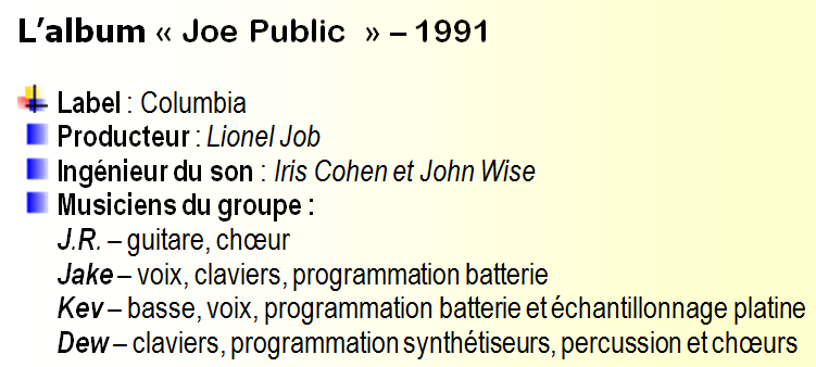 Mon avis : Exit Nate et Ike, pour un groupe plus resserré autour d’un projet cette fois à 90% New Jack mais avec un esprit funk en filigrane. Les sonorités rock sont supplantés, modernité oblige, par des sampling de nombreux titres originaux et rétro de HEATWAVE et de James Brown. L’esprit funk rude de Atension est conservé mais la rage fait place à une forme de revendication sociale et générationnelle plutôt bon enfant. La mise en musique se fait plus arrondie avec une simulation acoustique de la batterie, d'une vrai wah wah guitare, par une programmation des claviers plus fluide et discrète. Des alternances rap/funk dans l'alternance des couplets et refrains, des effets sonores et de solos guitares donnent un punch maitrisé qui vise juste. Le jeu de basse de kev est bluffant ; elle se fait plus profonde et structurante. Mis à part, deux ballades « I miss you » et « when i look in your eyes »; la première est poignante et la deuxième plus joyeuse, le contenu de l'album est entièrement orienté vers le groove avec des accents de New Jack. S’il existe un album passerelle entre le funk et le hip hop, c’est celui là. Les 10% restant est ce R&B que l’on devine au détour d’un refrain ou d’un solo aux claviers ; comme une influence lointaine qui ne disparaît jamais complètement ; c’est l’âme enfoui de JOE PUBLIC. Il est l’inspiration éternelle de la black exploitation.