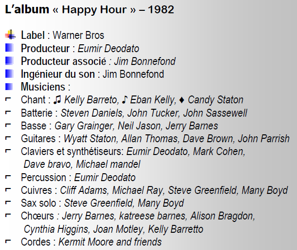Mon avis : Deodato s’approprie la recette gagnante qu’il a appliqué sur les albums de KOOL & THE GANG pour produire un album gaie, festif et 'menthe à l’eau' à destination d’un public jeune, blanc, plutôt issu des classes moyennes et aisées des quartiers résidentiels de la côte Est. L’instrumentalité repose sur une fluidité funk bien cousue, peu risqué et consensuelle. L’enregistrement donne un résultat clair, aérien. « keep on movin’ », « sweet magic » sont des grooves sucrés très instrumentaux un peu scolaires qui coulent d’eux même, plus agréable à écouter même s’ils sont destinés à nous faire danser. « happy hour » eut pu être dans le catalogue de KOOL & THE GANG, « keep it in the family » est un titre un peu plus nerveux mais forcé. Deodato s’essaye au R&B avec les autres morceaux qui demeurent proprets en dépit d’originalité. « Happy hour » est un bon album de funk, mais un peu facile pour celui qui a su maitriser des concepts musicaux plus subtils la décennie précédente.