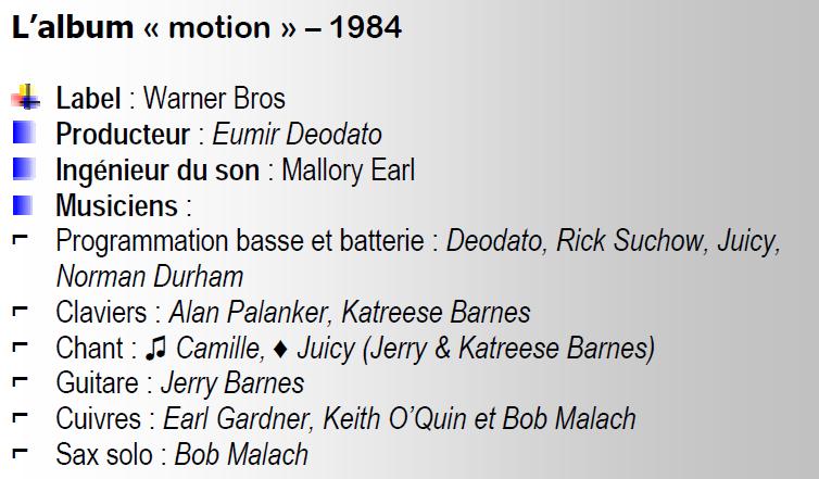 Mon avis : Plus Ep que Lp, Deodato nous présente un album réduit sur un concept funk underground bâtis sur une instrumentation minimaliste mais efficace. Le couple "moog bass" et "drum machine" fonctionnent avec métronomie comme une roue inertielle. « S.O.S. fire in the sky » est un hit réduit à sa plus simple expression, presque caricatural, destiné aux clubs branchés de l’époque assis sur un fond sonore synthétique auquel il ne manque plus que la fumée pour suggérer une nouvelle dimension. « bus stop » est une greffe improbable de fusion jazz (solos de sax et de Rhodes) sur une rythmique immuable qui tourne en boucle. « never knew love » et « are you for real » sont des titres un plus peu plus joués, funk et pop funk dont les mélodies sont agréable à écouter. Plus conceptuel, que véritablement composé, « motion » est un album jet de son temps quand électro-funk, ‘skateboard’ et ‘breakdance’ était un courant culturel aux Etats Unis. Deodato n’a fait qu’explorer cet univers un peu comme on s’inspire du nouveau pour l’adapter avec compromis et rester un artiste de son époque.