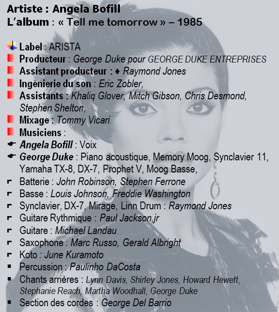 Mon avis : Pour succéder à la machine à hits de Narada qui fonctionne bien mais qui produit des titres standardisés, George Duke aux manettes se devait de relever le défi de concilier les inspirations artistiques d’Angela vers plus d’authenticité et les attentes du label en terme de pop mainstream commercial. Pour cela, George Duke a sorti son arsenal de claviers et de synthétiseurs dernier cri, a recruté des musiciens féroces de studio pour offrir des titres qui sonnent bien l’esprit de l’époque même s’ils ont un peu vieilli. Les nappes de Synclavier dont George Duke se régale d’accords improbables, la basse slappée de Louis Johnson, la batterie appuyée de John Robinson, les riffs incisifs de guitare rythmique de Paul Jackson,jr aurait du faire merveille, mais le résultat est un peu en deçà des attentes. On se délecte cependant de quelques titres qui nous plongent dans la rêverie d’adolescent que nous étions, comme une masturbation secrète devant une représentation naïve d’une voix alto éruptive, d’une excitation par un son puissant et enveloppant. Même si « tell me tomorrow » génère des émotions pas toujours saisissables, il a eu l’honnêteté de ne pas prétendre viser plus haut qu’une ambition commerciale, aujourd’hui une emprunte du mélange des genres et des musiques qui ont marqué la décennie 80 pour le meilleur et pour le pire.