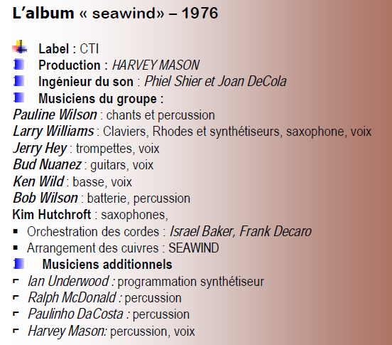 Véritable légende musicale dans la catégorie jazz fusion/R&B, Seawind a révolutionné la scène musicale californienne par un véritable esprit de groupe et de créativité. Cette formation de musiciens chevronnés et doués initialement basée à Honolulu même s’ils sont continentaux à l’origine (sauf pauline Wilson ; véritable hawaïenne), s’appuie sur Larry Williams-claviériste et saxophoniste, Jerry Hey-trompettiste, Pauline Wilson-diva sensuelle et funky, Bob Wilson-batteur et percussionniste, Bud Nuanez-guitariste, Ken Wild-bassiste et Kim Hutchcroft aux saxophones et à la flute. Le son SEAWIND est reconnaissable entre tous par un groove cuivré, nerveux sans être agressif, des mélodies aérées, des compositions sophistiquées et charmeuses qui fleurent bon la moiteur des climats ensoleillés.