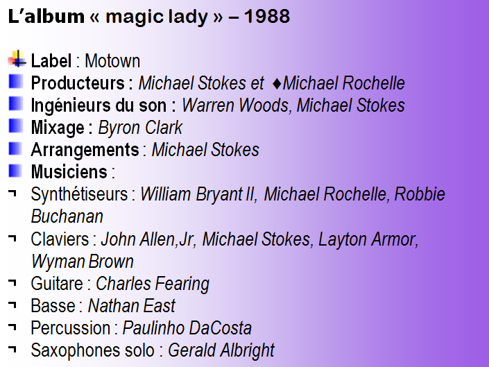 Mon avis : Un gros staff de production pour un casting réduit de musiciens et de programmateurs font présager un produit marketing plutôt qu'un projet artistique. Il semblerait que Jackie Ball en soit la principale interprète même si le doute est savamment entretenu sur l'identité de magic lady . Celle-ci commence avec enthousiasme à entonner "betcha can’t loose" qu’il faut reconnaitre est assez bluffant sur la forme, surtout au niveau de la programmation, mais il demeure le seul titre de gabarit hit de l’album. Les titres co-produits par Michael Rochelle sont chargés en synthétiseurs et ne méritent que l’on s’y intéresse. Les autres titres sont échantillonnesques de ce que la programmation synthétiques pouvait prétendre à l’époque et donnent toujours dans la même coloration ; R&B électro qui rappelle BY ALL MEANS et accords cristallin aux claviers. Heureusement Gerald Albright met de la douceur dans cette atmosphère chargée de sons et de batteries/basse synthétiques que l’on peut toujours appréciés même si ça été largement entendu. Les interprétations sont sincères, les voix sont plutôt suaves, les mélodies sont jolies mais les compositions manquent de force pour prétendre au statut de hits. Magic Lady demeurera un songe aussi évanescente que son contenu, à portée confidentielle ou au rang d’artiste obscur qu’il peut être intéressant de redécouvrir pour se replonger dans nos premiers émois amoureux…de ces musiques sentimentales.